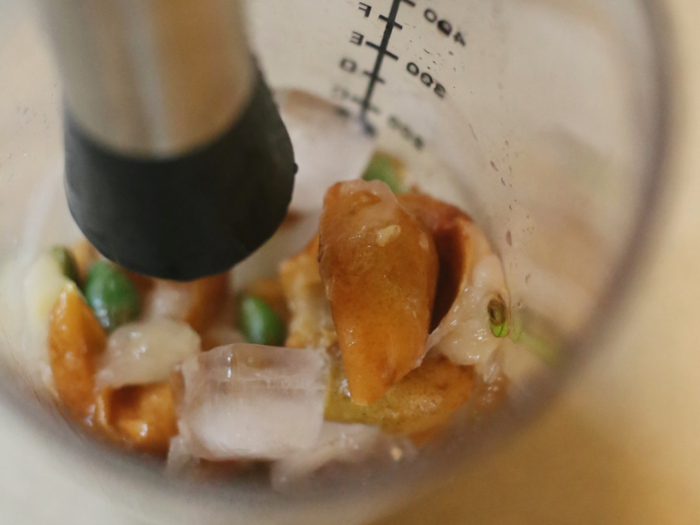 2.黄皮加入少许冰块,捣出黄皮汁,注意不要把黄皮核捣碎。