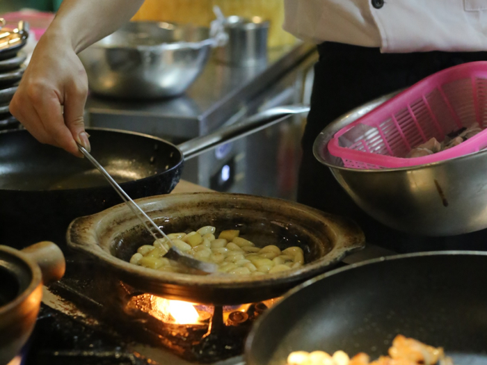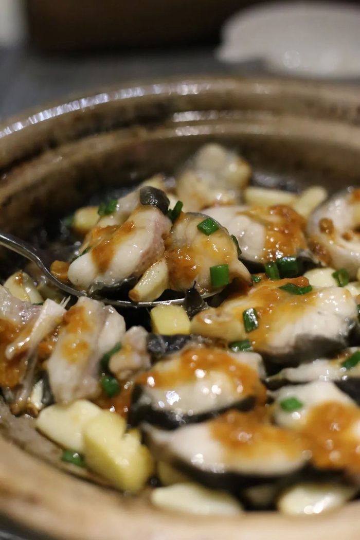 砂锅热油后,只见师傅将大量蒜子铺在锅底爆香。待蒜子色泽变金黄时,再逐片放入用油、盐、糖、生粉、生油捞入味的鳝鱼。盖上锅盖焗1分钟左右,即能闻到鳝鱼肉的阵阵香味,此时便是黄皮酱入馔的最佳时机。“鳝鱼肉快熟时再放黄皮酱,焗约半分钟,上桌前沿锅盖淋上几圈花雕酒和九江双蒸即可。”廖嘉可说。