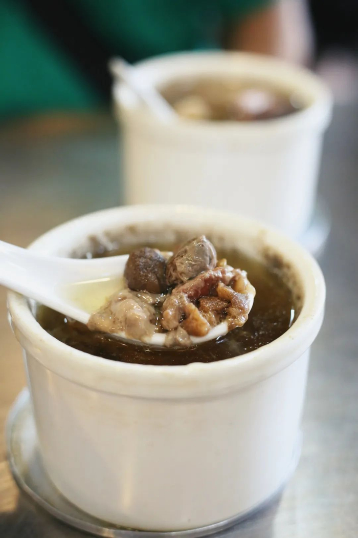 别看这盅小小的炖汤食材再简单不过,只有黄皮、猪展以及几片生姜,但揭开盅盖时,浓郁的黄皮香味便扑鼻而来。浅尝一口,味道咸酸交杂,非常醒胃,在炎热的夏天喝最适合不过。与咸柑桔和咸柠檬一样,盐渍过的黄皮同样具有化痰的功效。陈姨表示,店内炖汤用的黄皮是师傅自己用盐腌渍而成的。“黄皮的核和皮都是精华,连皮带核一起炖汤,才能达到健胃消食,生津化痰的效果。不少熟客都会特意来喝上一盅岭南黄皮炖猪展,他们说这是在其他地方喝不到的味道。”