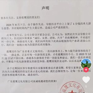 8月9日晚,鹿鹰园景区在社交平台发布声明称,8月7日,由于操作失误,导致抖音平台上上架了1分钱的单人游乐套票,并在短时间内产生大量订单,造成公司严重的损失。事件发生后,公司立即召开紧急会议,公司认为,虽然此次失误导致损失巨大,但是园区不会劝退任何一份订单。