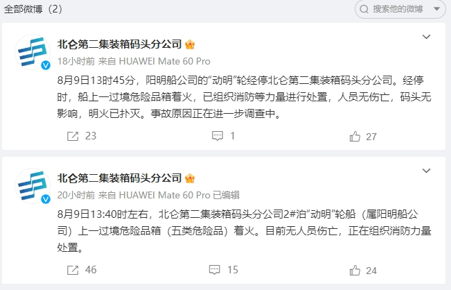 事故一发生,宁波舟山港股份有限公司北仑第二集装箱码头分公司迅速在微博申请认证官方账号,并第一时间通过该账号发布了两条通知: