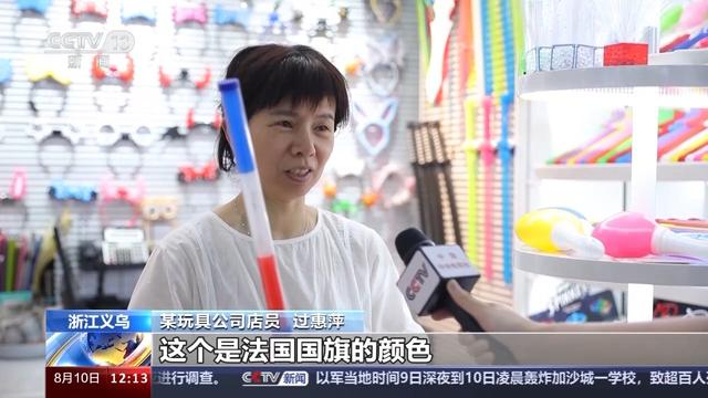 某玩具公司店员 过惠萍:这个是法国国旗的颜色,这款走量还可以,比往年订单多10%到20%。