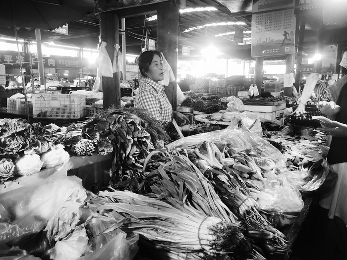 在另一家蔬菜摊位前,新鲜的叶类蔬菜品种齐全。摊主杨师傅介绍,尽管已经立秋,但气温高,加之山东等蔬菜产地下雨,很多蔬菜收成受到了影响。“主要还是气温高成本大,批发价格居高不下,比如菠菜、小香葱、莲花白等市场零售价格都有所上涨。”