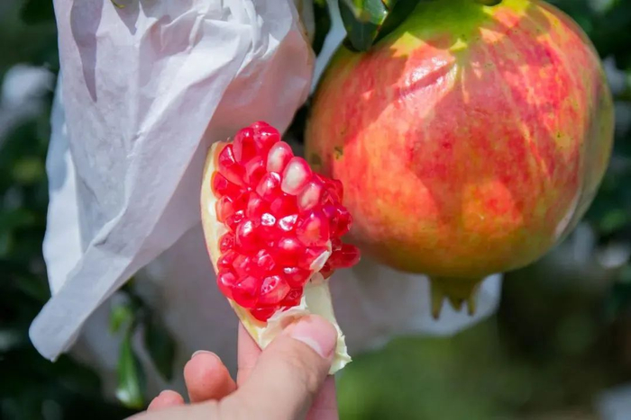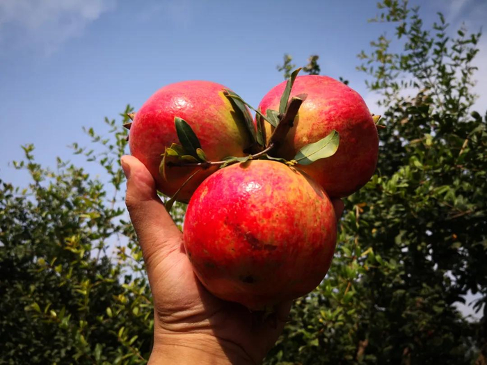 如此优越的种植环境,精心培育也十分重要,市面上石榴品质参差不齐,主要因为对果树的养护不够细致。