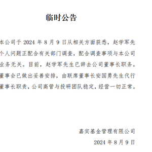 8月9日,嘉实基金发布临时公告,嘉实基金董事长赵学军因个人问题正配合有关部门调查,配合调查事项与公司基金业务无关。