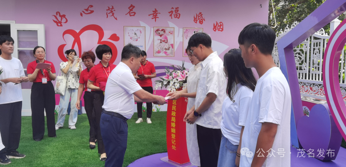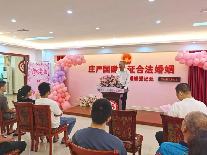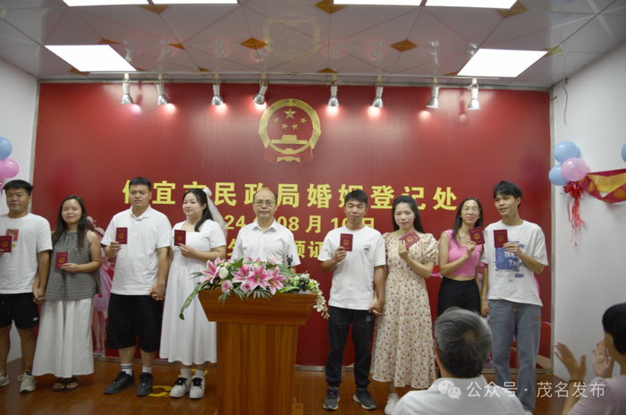 七夕当天,茂名市民政局党组成员、副局长、三级调研员叶培进、化州市民政局局长黄强等出席集体颁证仪式,为新人送去新婚祝福。