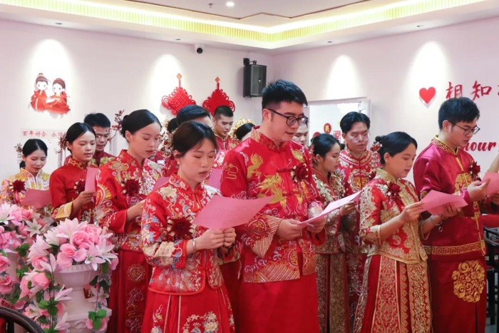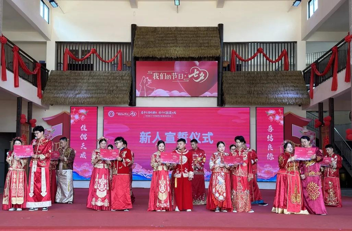 “10对佳缘,着圆红袍、凤冠霞帔,两姓联姻,缔约一堂,结秦晋之好,行华夏大礼。良辰美景,珠联璧合,此刻,吾等咸集于此,共同庆贺。”在颁证员的主持下,10对新人依次完成却扇礼、结发礼、合卺礼及夫妻鞠躬致谢,以传统仪式呼应七夕节的浪漫寓意、以简约却庄重之礼赓续中国婚俗文化精髓、以集体颁证形式践行文明简约的现代婚俗新风。