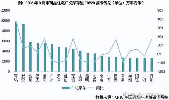 我这里只能找到2022年9月份的数据,当时青岛的广义库存量接近1亿平方米,位居全国第一。武汉的广义商品住宅库存量也在9000万平方米之上,位居全国第二。