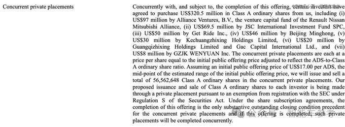除了增发股份之外,文远知行还表示完成IPO的同时,还会以私募方式,出售价值3.205亿美元(折合人民币约为23亿元)的A类普通股。