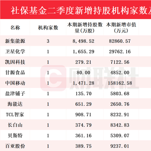 从最新持仓动向来看,社保基金新进入11家个股的前十大流通股东名单。其中,新集能源新增社保基金持股家数最多,达到三家。此外,卫星化学、凯因科技、甘源食品、中国移动、盐津铺子、海能达、TCL智家、长白山、贝斯特和百亚股份在内的10家上市公司新增社保基金持股家数均达到1家。具体情况如下图: