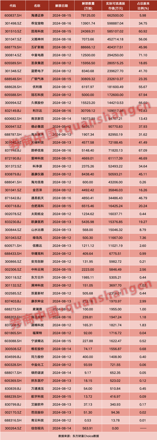 数据显示,本周(8月12日~8月16日)共有53家公司限售股陆续解禁,合计解禁量42.14亿股,按8月9日收盘价计算,解禁市值为518.09亿元。