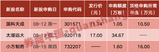 本周(8月12日~8月16日)有3只新股发行。周一:国科天成;周二:太湖远大;周四:小方制药。