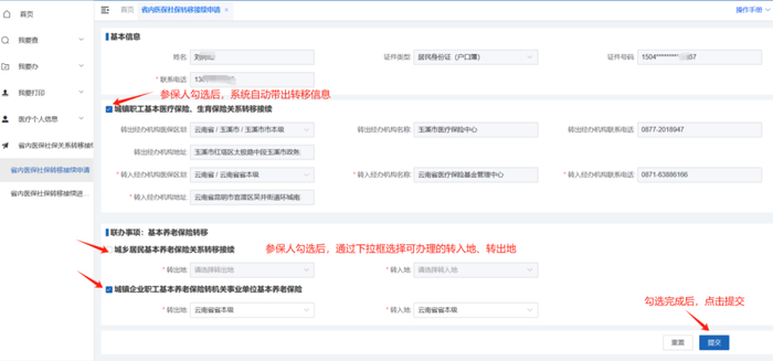 7.跳转到用户申请界面,参保人可根据实际情况自主勾选需要办理的业务(可以仅勾选人社养老保险转移,也可以仅办理医保转移接续,也可以三个事项同时办理)