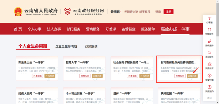 5.点击【省内医保社保关系转移接续】,点击【在线办理】