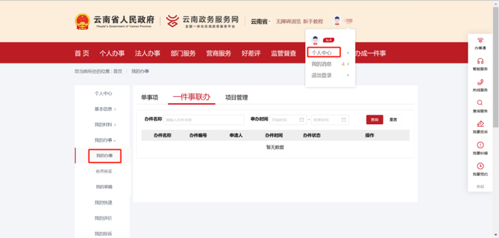 8.参保人提交成功后,后续事项由医保经办人员在业务基础子系统办理。办理完成后,参保人可通过政务服务平台查询办理结果,点击【个人中心】——【我的办事】,查看办件结果