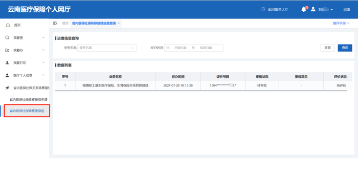 点击【省内医保社保转移接续进度查询】,可查看申请的转移接续办理进度