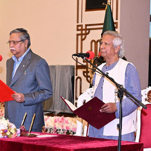 穿着和落地时一样的衣服,尤努斯在几个小时后就在孟加拉国总统官邸宣誓就职。出席就职典礼的嘉宾包括各国外交使节、民间代表,商界人士以及各政党代表,不过前总理哈西娜的政党代表没有出席。