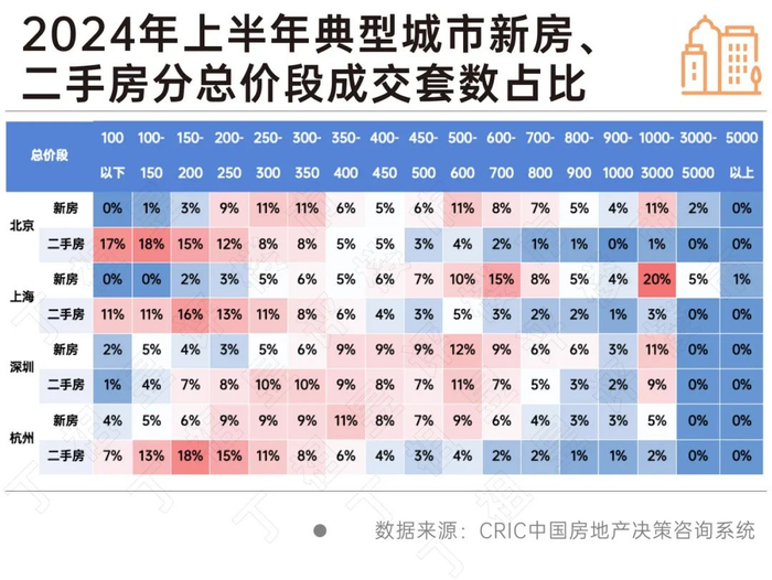 在这背景下,不同城市、区域市场分化行情进一步显现,其中二手房市场活跃度明显高于新房。我们通过上半年市场成交结构发现,不同城市表现特征不一。