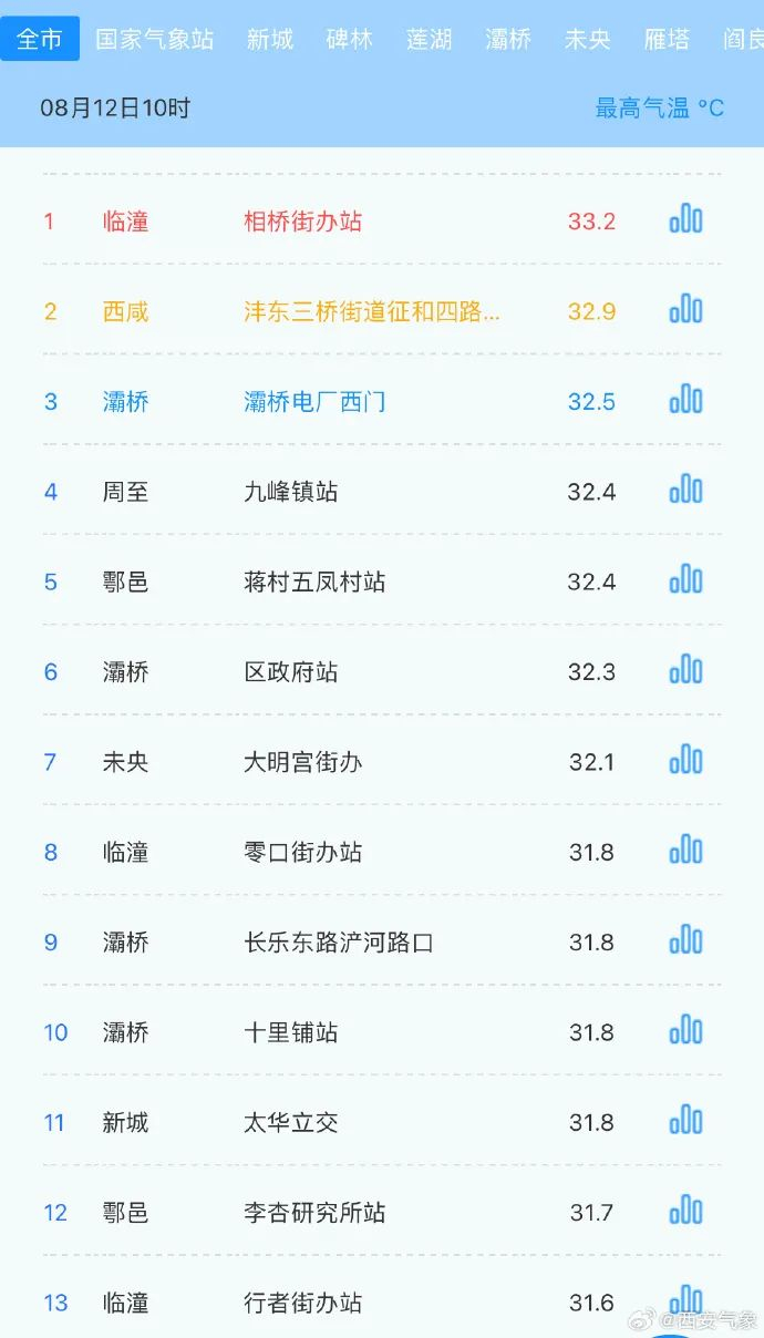 受西北气流影响,预计8月12日西安大部、咸阳南部、杨凌、渭南中部、汉中大部、安康大部、商洛南部有35℃以上的高温天气,其中汉中东部、安康中南部有37℃以上的高温天气。