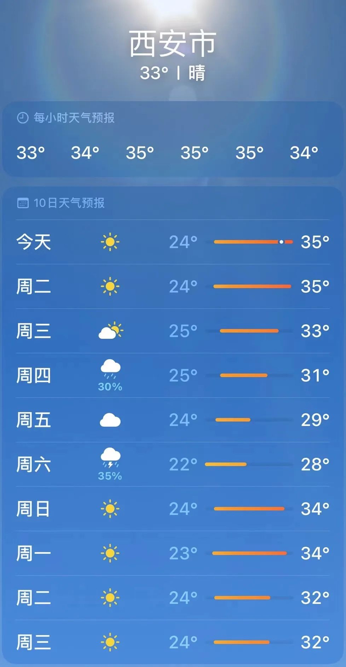 据西安气象消息,受西北气流影响,预计今天白天到明天西安市以晴到多云天气为主,午后气温较高,预计部分地方最高气温仍将升至35℃以上。