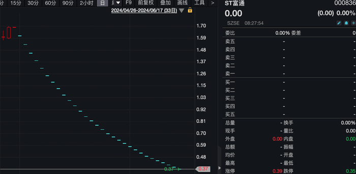 ST富通自6月18日起停牌,停牌前股价报0.37元/股,已连续30个交易日跌停,市值4.5亿元。