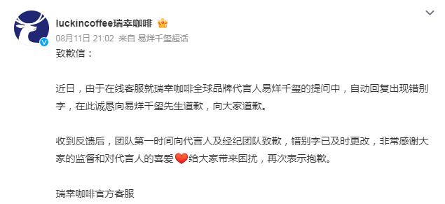因在线客服将代言人易烊千玺名字写错,瑞幸咖啡于8月11日晚通过官微发布致歉信,向易烊千玺及公众道歉。