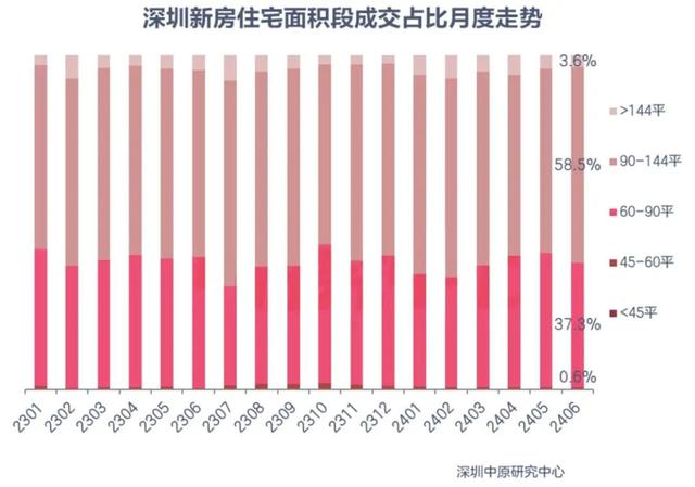 在福田市场上,住宅中的小户型已成绝版产品。今年6月,深圳60㎡以下的住宅成交已降至0.6%,福田核心区占比为0。