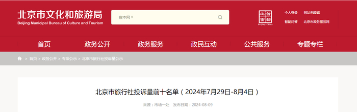 北京市旅行社投诉量前十名单(2024年7月29日-8月4日)