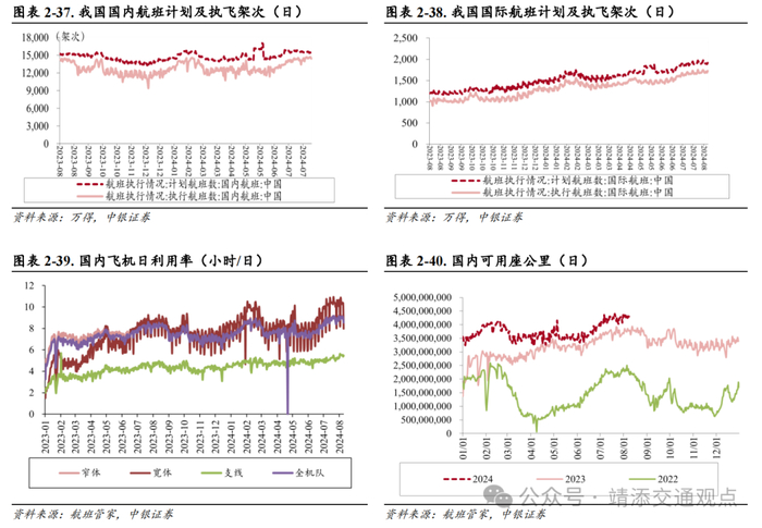 国内飞机日利用率环比上升。2024年8月3日﹣2024年8月9日,中国国内飞机利用率平均为8.97小时/天,较上周日均值上升0.04小时/天;窄体机利用率平均为9.06小时/天,较上周日均值上升0.04小时/天;宽体机利用率平均为10.10小时/天,较上周日均值下降0.04小时/天。