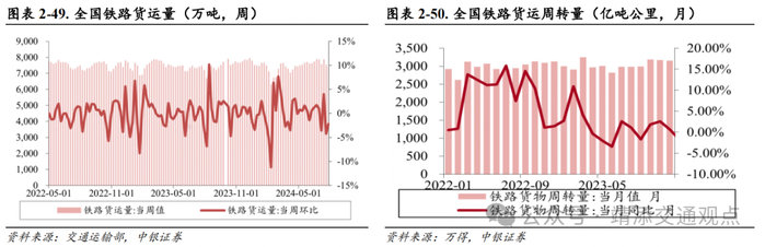 7月29日-8月4日 国家铁路累计运输货物7297.1万吨,环比下降0.97%。2023年以来,全国铁路运输呈现客运回暖向好、货运持续高位运行良好态势。根据交通运输部发布数据显示, 2024年6月,全国铁路货运周转量为2944.4亿吨公里,同比上升4.20%。