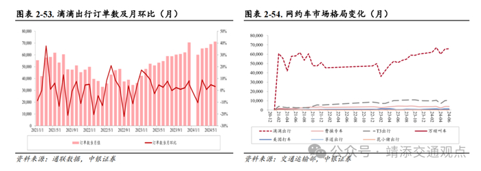 滴滴出行2024年6月份市占率79.15%,环比上升0.06%。2024年6月,滴滴出行、曹操专车、T3出行、万顺叫车、美团打车、享道出行、花小猪出行市占率分别为79.15%/5.29%/12.05%/0.36%/0.97%/1.94%/0.25%,环比上月分别+0.06pct/+0.45pct/-0.35pct/-0.01pct/-0.03pct/-0.10pct/-0.02pct。
