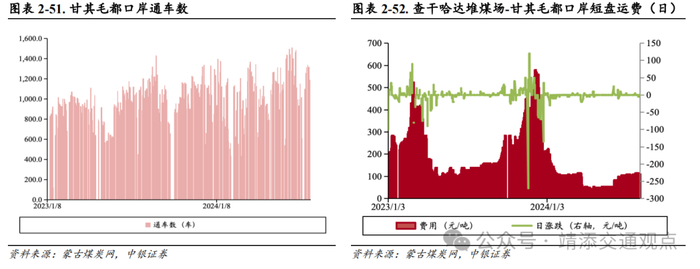 7月29日-8月2日,查干哈达堆煤场-甘其毛都口岸炼焦煤短盘运费日均111.00元/吨;7月22日-7月28日,通车数环比上升51.09%,日平均通车1048.57辆。本周查干哈达堆煤场-甘其毛都口岸炼焦煤短盘运费环比减少3.48%,2024年7月29日-8月2日均值达111.00元/吨,比上周减少3.48%。7月22日-7月28日,日平均通车1048.57辆,环比+51.09%。