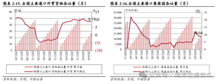 2.2.2 量:2024年1-6月全国港口货物、集装箱吞吐量分别为85.63亿吨/16184万标箱