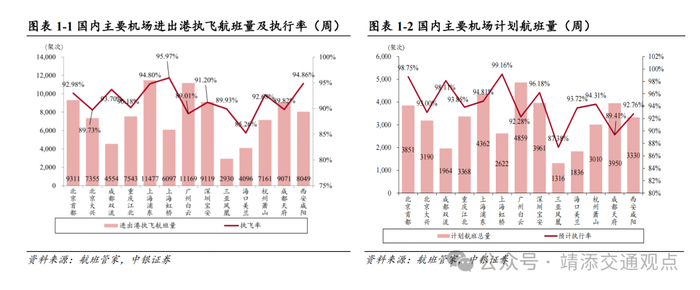 机场方面:本周(8.2-8.9):国内进出港执飞航班量TOP5机场依次是上海浦东机场(11477班次)、广州白云机场(11169班次)、北京首都机场(9311班次)、深圳宝安机场(9119班次)、成都天府机场(9071班次)。各枢纽机场国内航班量周环比变化:首都+0.77%、大兴+1.43%、双流+0.82%、江北+0.80%、浦东+0.25%、虹桥+2.64%、白云+4.46%、宝安+3.64%、三亚+0.93%、海口+0.56%、萧山+0.65%、天府+1.51%、咸阳+0.60%。