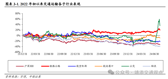 年初至今:2024年初以来,上证综指、沪深300累计涨跌幅分别为-3.79%、-2.90%,交通运输指数+1.41%;交通运输各个子板块来看,铁路公路+10.14%、航空机场+0.12%、航运港口+11.35%、公交+43.83%、物流-12.70%。