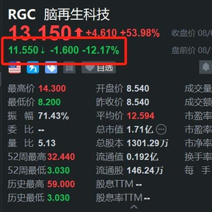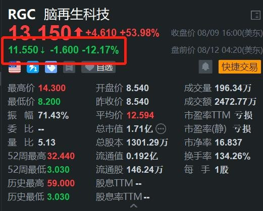 脑再生科技盘前跌超12% 上周五曾暴涨54%