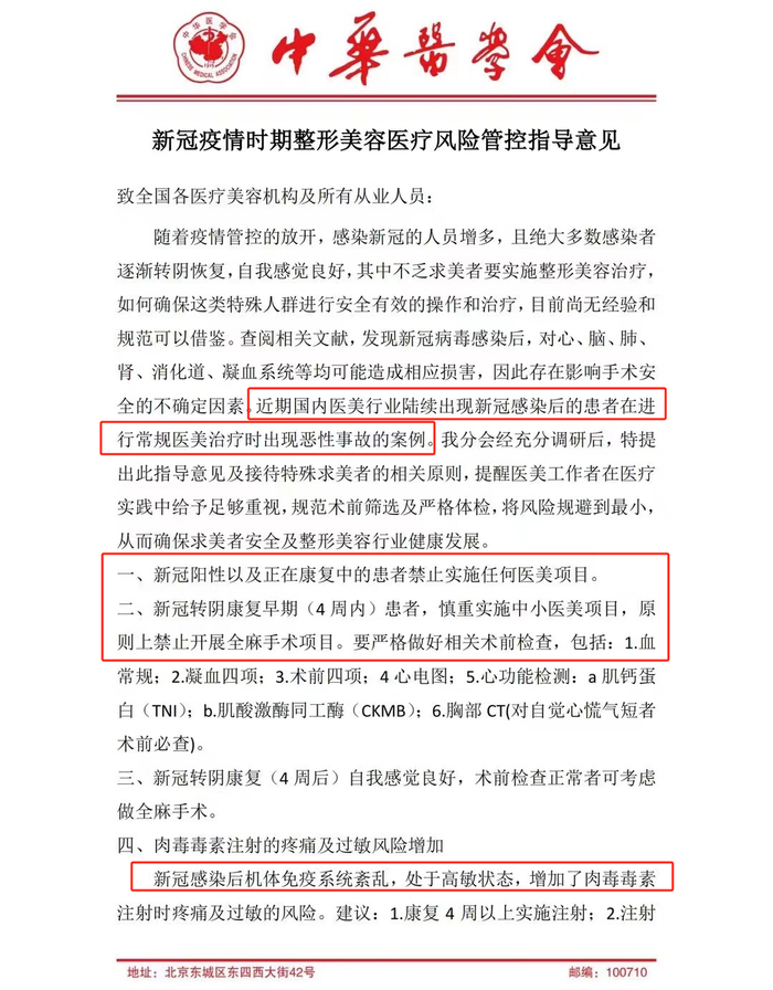 陈为立向记者提供了2023年元旦当天中华医学会医学美学和与美容学分会印发的《新冠病毒感染时期整形美容医疗风险管控指导意见》。该意见指出,鉴于陆续出现新冠病毒感染后的患者在进行常规医美治疗时出现恶性事故的案例,建议新冠阳性以及正在康复中的患者禁止实施任何医美项目;新冠转阴康复早期(4周内)患者,慎重实施中小医美项目,原则上禁止开展全麻手术项目。