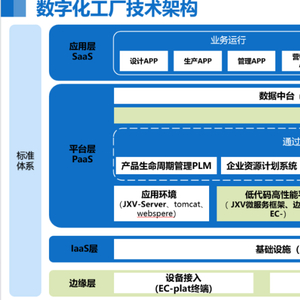 通过生产系统核心流程数字化,应用新一代信息技术和自主研发关键技术实现生产过程信息流自动化、制造过程数字自动化、物流自动化。技术架构如下: