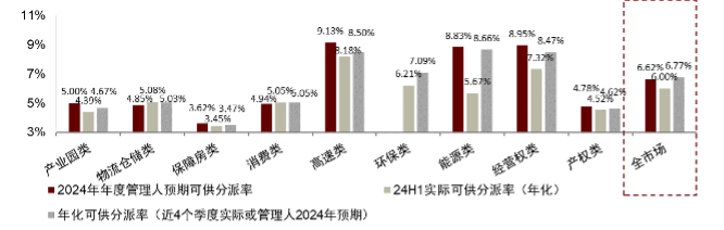 注:1)2024年年度管理人预期可供分派率基于各REITs招募书中的管理人预测2024年度可供分配金额计算;24H1实际可供分派率(年化)基于各REITs2024年二季报披露的本年累计可供分配金额(易方达深高速REIT剔除首次分红中的现金增补部分)计算,按实际运营天数年化;年化可供分派率(近4个季度实际或管理人2024年预期)的计算中,有历史季报的REITs基于各REITs23Q3至24Q2累计可供分配金额(中金山东高速REIT剔除首次分红中的现金增补部分)计算,没有历史季报的REITs按招募书中的管理人预测2024年度可供分配金额计算,均按实际运营天数年化;C-REITs全市场、产权类REITs及经营权类REITs分派率采用总市值加权法计算;2)未发布2023年年报的REITs采用拟募集金额测算NAV,已发布2023年年报的产权REITs项目的NAV测算方式为(期末基金净资产+资产评估公允价值-投资性房地产-等同于发行溢价部分的商誉(如有))/发行份额,除华泰江苏交控REIT以其2023年年报披露的期末基金份额公允价值参考净值计算外,已发布2023年年报的经营权REITs项目的NAV均以账面净资产价值计算;3)C-REITs全市场、产权REITs、经营权REITs及各板块REITs收益率为模拟流通市值加权总回报指数的收益率,单个REIT的收益率则基于前复权价格计算;4)数据截至2024年8月9日