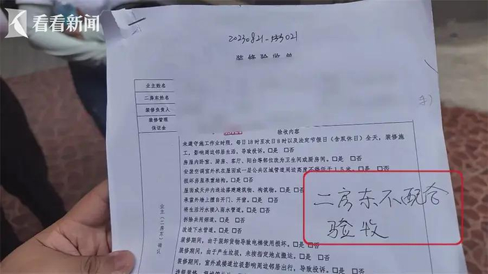 而浦东新区的浦江东旭公寓小区同样也有装修登记的流程,张女士家楼上的这户,装修验收单上写着“二房东不配合验收”的字样。