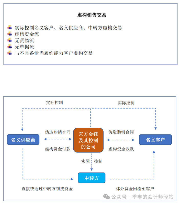 2016年12月至2018年5月间(以下简称涉案期间),东方金钰为完成营业收入、利润总额等业绩指标,虚构其所控制的子公司瑞丽市姐告宏宁珠宝有限公司关于(以下简称姐告宏宁)与六名自然人名义客户之间的翡翠原石销售交易,对应交易不具有商业实质和真实性,虚增收入。