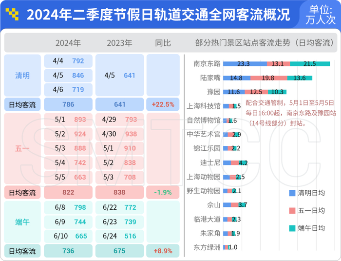 二季度清明期间,全网轨交日均客运量达786万人次,去年清明仅一天假期,客流较少;五一期间,全网轨交日均客运量达822万人次,同比下降1.9%;端午期间,全网轨交日均客运量达736万人次,同比上升8.9%。热门景区相关站点中,南京东路、陆家嘴、豫园客流较高。