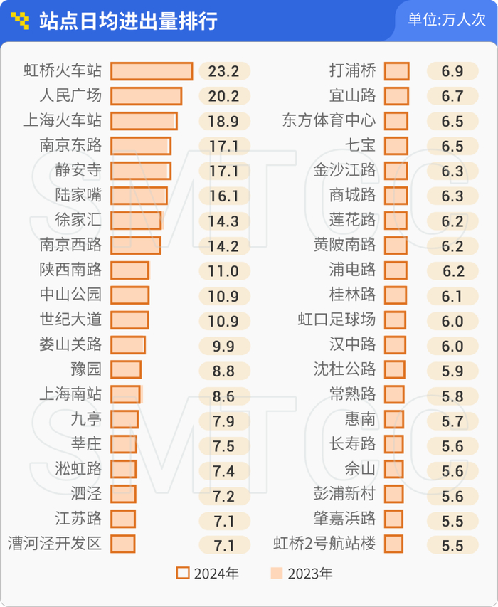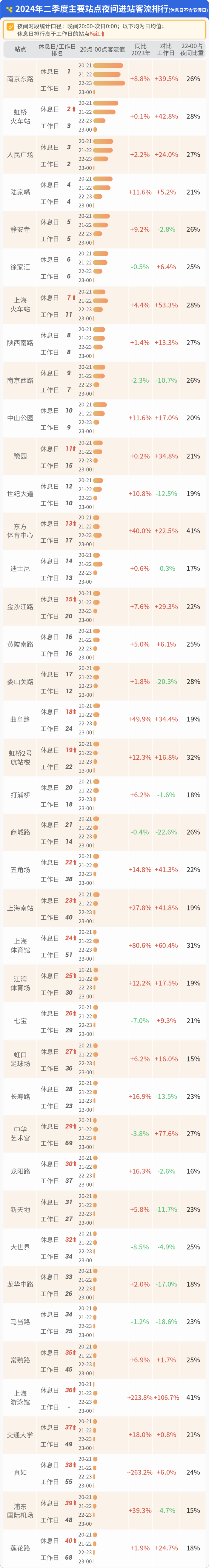 岗位相对密集区域站点方面,陆家嘴、静安寺站客流同比分别上升4.5%、3.9%,仍位居前二;漕河泾开发区、徐家汇客流同比有所下降;浦东南路、金吉路涨幅超10%;同比增幅排行榜中,龙耀路(徐汇滨江)、真如(中海环宇城MAX开业)、中华艺术宫等站值得关注。