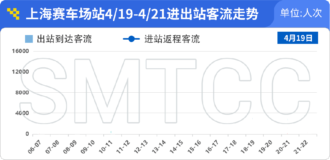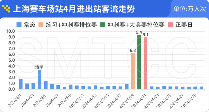 F1中国大奖赛于今年4月19日至21日在上海国际赛车场举行,期间轨交上海赛车场站日均进出站客流达8.3万人次,较2019年赛程期间上涨57.8%。与往年赛制不同,今年增加了“冲刺赛”,因此4月19日和20日轨交进、出站客流也分别出现了两波高峰,4月20日全天进出站客流达9.4万人次。