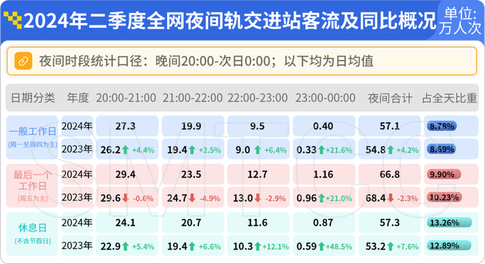 二季度夜间时段(20:00—0:00)出行总量同比有所上升,同比2023年,全网一般工作日及休息日夜间各时段进站客流有所增加,周五(或节前最后一个工作日)小幅下降;休息日夜间客流比重达13.26%,22:00-0:00客流显著上升。