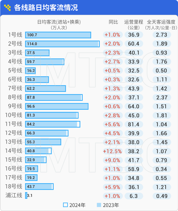 线路客流排行,2号线、1号线和9号线日均客流依然位列前三;增幅较大的线路分别是14号线和15号线,同比分别上升12.5%和9.0%;客运强度方面,1号线由于运营里程短,强度达到了2.73万人次/公里·日,8号线紧随其后,11号线、16号线尽管运营里程较长,客运强度被稀释,但其早晚高峰时段受潮汐客流影响,也存在部分区段拥挤的情况。