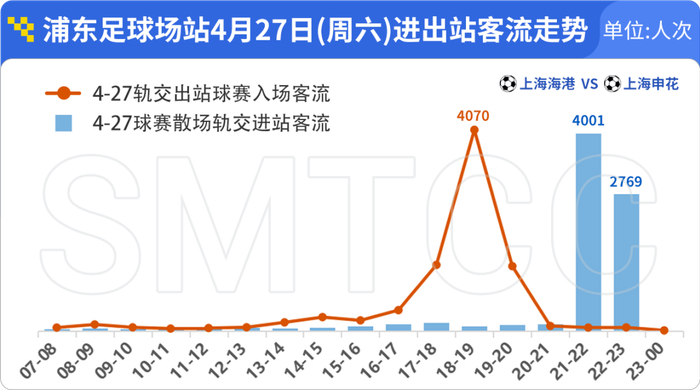 日常客流较低的14号线浦东足球场站,也因为4月27日上海海港对阵上海申花的德比大战,全天客流增长7倍达到1.66万人次,散场客流高峰21:00-22:00小时进站客流达4001人次。