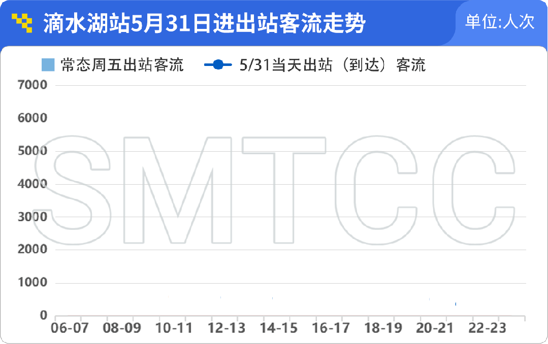 5月31日(周五)滴水湖烟花秀(19:30-19:50)吸引了众多市民游客前往,部分观众与周五通勤客流叠加,18:00-19:00出站客流较同期增加了6倍达4481人次,19:00-20:00出站客流也达到了3397人次。散场进站客流则相对集中,20:00-21:00进站客流达5849人次,为同期的20倍。