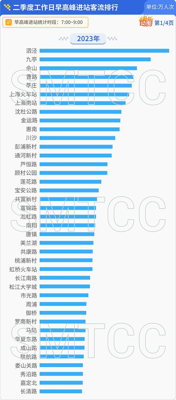 2024年二季度工作日早高峰进站及出站客流同比2023年,居住相对密集区域客流最大的五个站点仍是泗泾、九亭、佘山、曹路、莘庄;封浜、花桥、双江路、临洮路、双柏路客流涨幅居前;枢纽类站点上海火车站、上海南站进站客流同比上升,排名靠前。