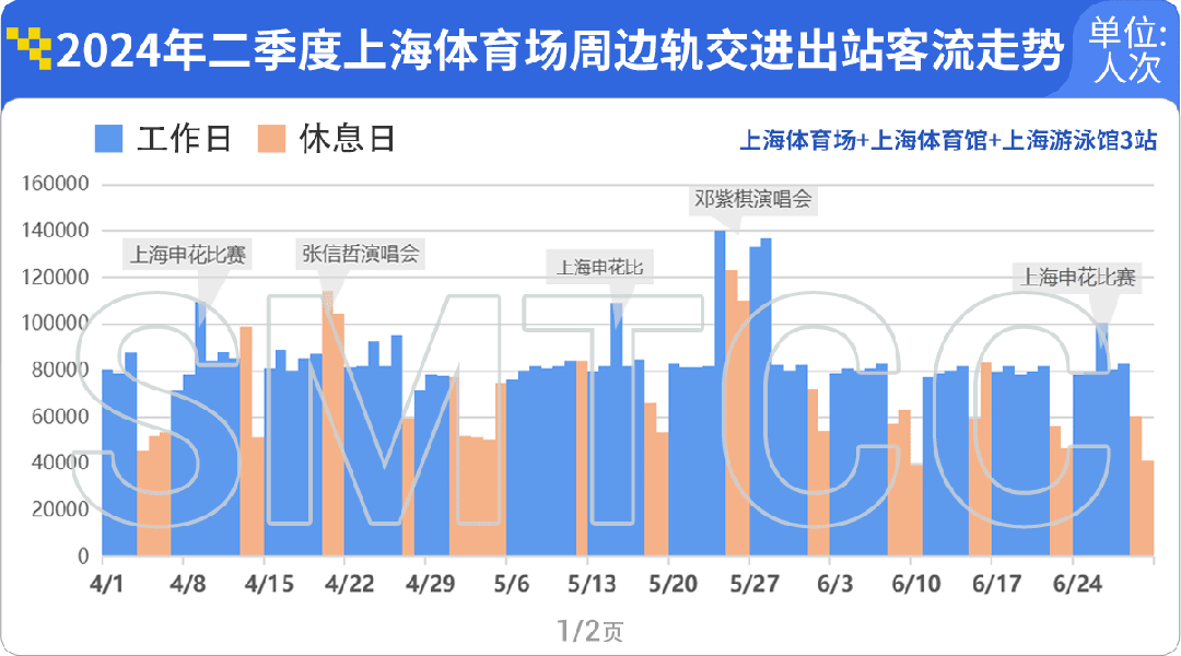 场馆演出和赛事方面,二季度上海体育场区域大客流主要发生在上海申花足球队的部分比赛日,而演唱会方面客流较大的包括4/20-4/21演唱会和5/24-5/28演唱会;虹口足球场仅有4/20演唱会当日客流较高;东方体育中心、中华艺术宫(奔驰文化中心)二季度没有显著的大客流出现。